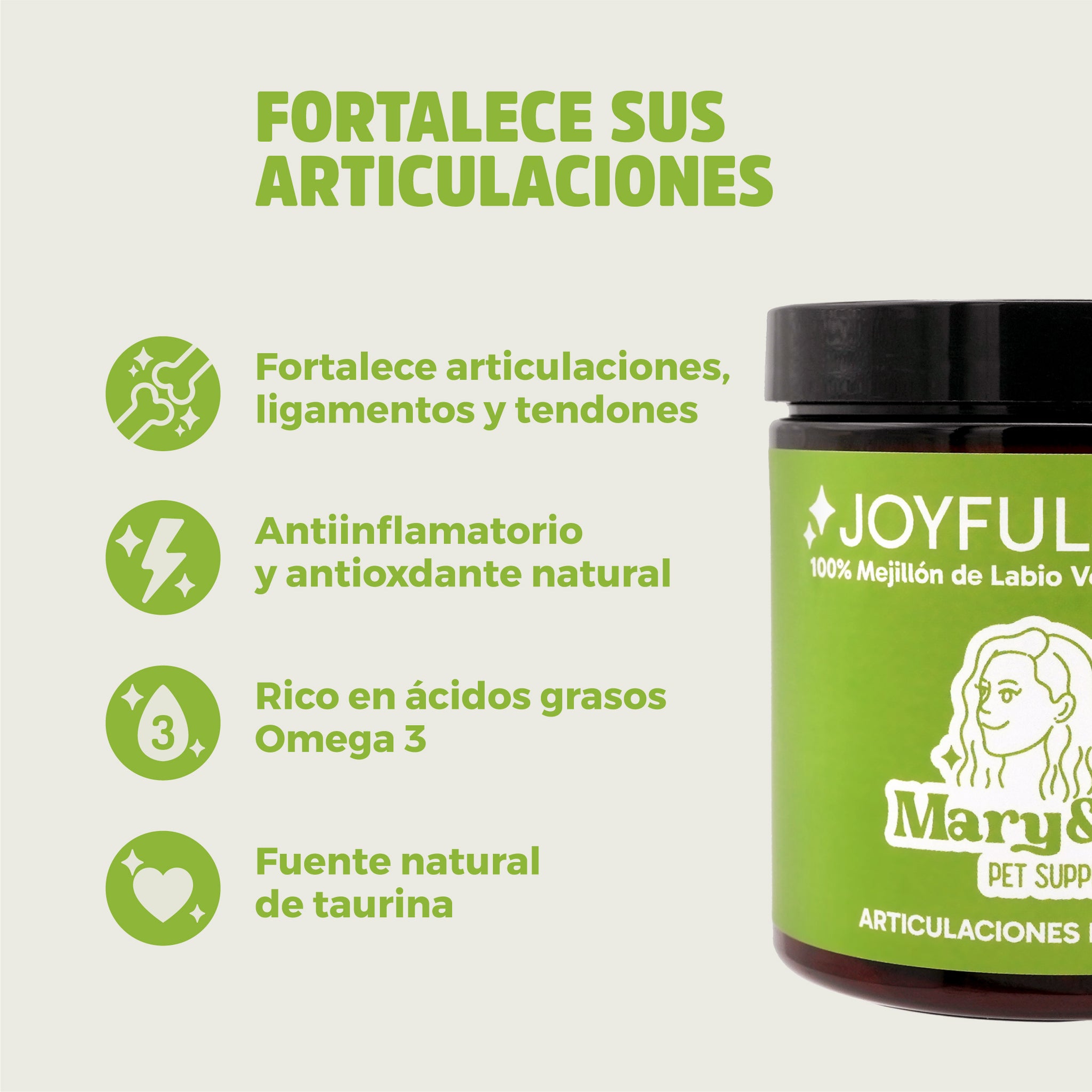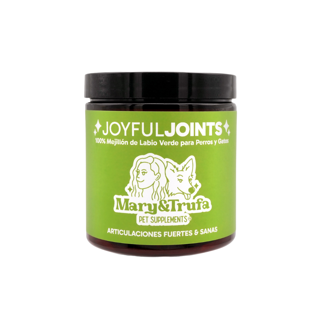 Joyful Joints es un suplemento 100% natural de Mary&Trufa, elaborado únicamente con mejillón de labio verde de Nueva Zelanda (Perna canaliculus), uno de los ingredientes más completos y eficaces para el cuidado articular de perros y gatos.