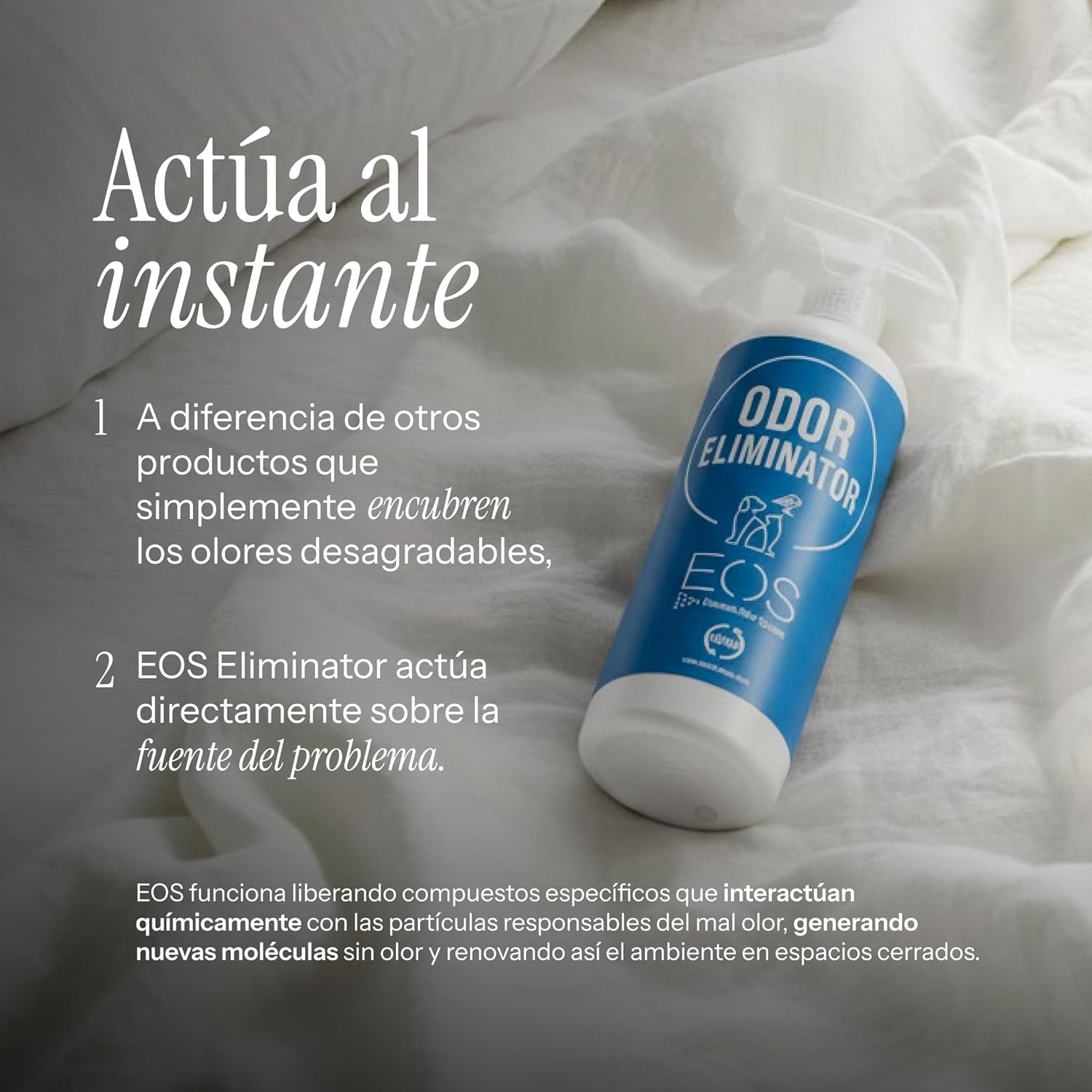 En marzo de 2021, EOS mejoró su fórmula y su packaging para reforzar todavía más su eficacia. El resultado es un neutralizador que ahora combate mejor que nunca el olor a orín y que utiliza un aroma cítrico específico para atacar esos olores difíciles. De verdad, funciona de forma espectacular.